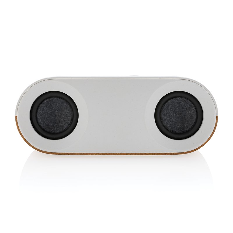 10W wireless speaker made from FSC® 100% cork and RCS (Recycled Claim Standard) certified recycled ABS. Total recycled content: 25% based on the total weight of the item. The RCS certification guarantees a completely certified supply chain of recycled materials. The speaker is equipped with a 1200 mAh battery to ensure up to 10 hours of play time and BT5.3 for a smooth connection and clear sound. Connection range of up to 10 meters. With microphone and call pick up function to answer calls. Presented in FSC mix FSC® box. Includes charging cable made from RCS certified recycled TPE. Item and accessories 100% PVC free.