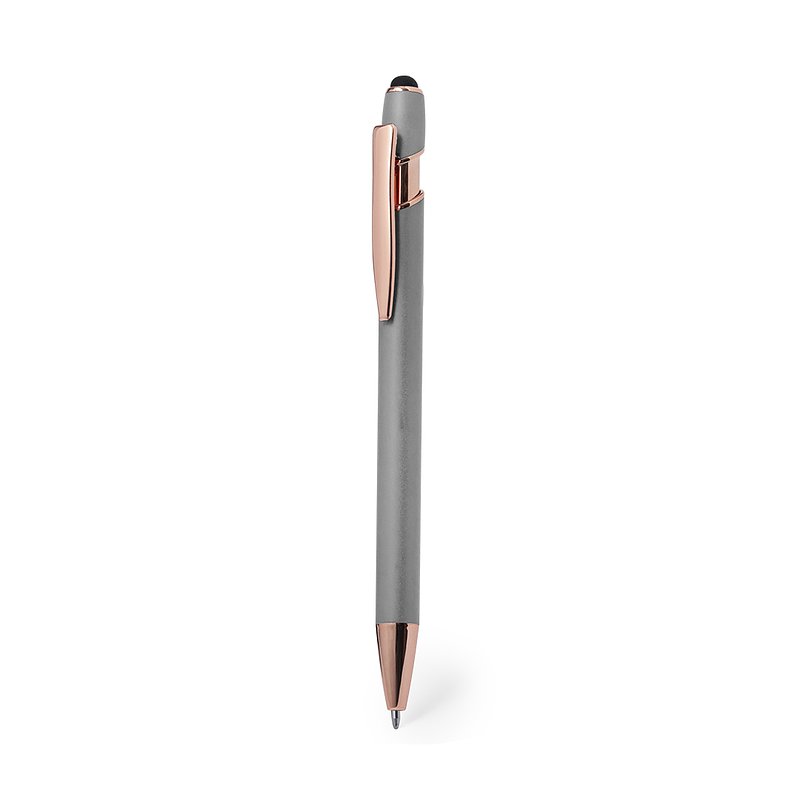 Excellent aluminum pointer pen with push mechanism. Body made of durable matte-finished aluminum with decorative elements in an elegant copper finish, with the barrel in a wide range of distinctive colors. Metallic clip, with retractable button and black pointer at the top. In blue ink. Presented in a recycled individual bag.