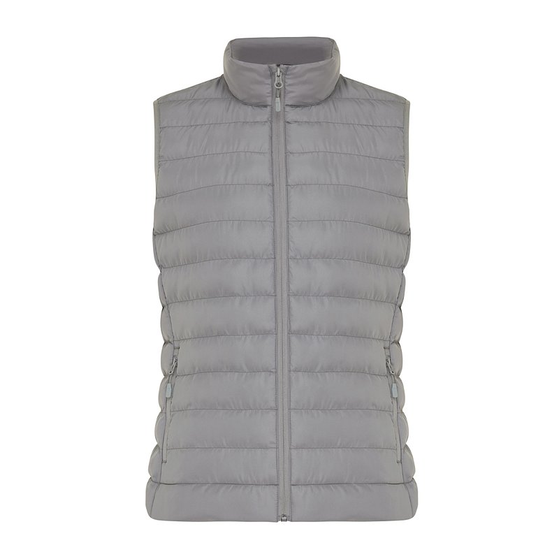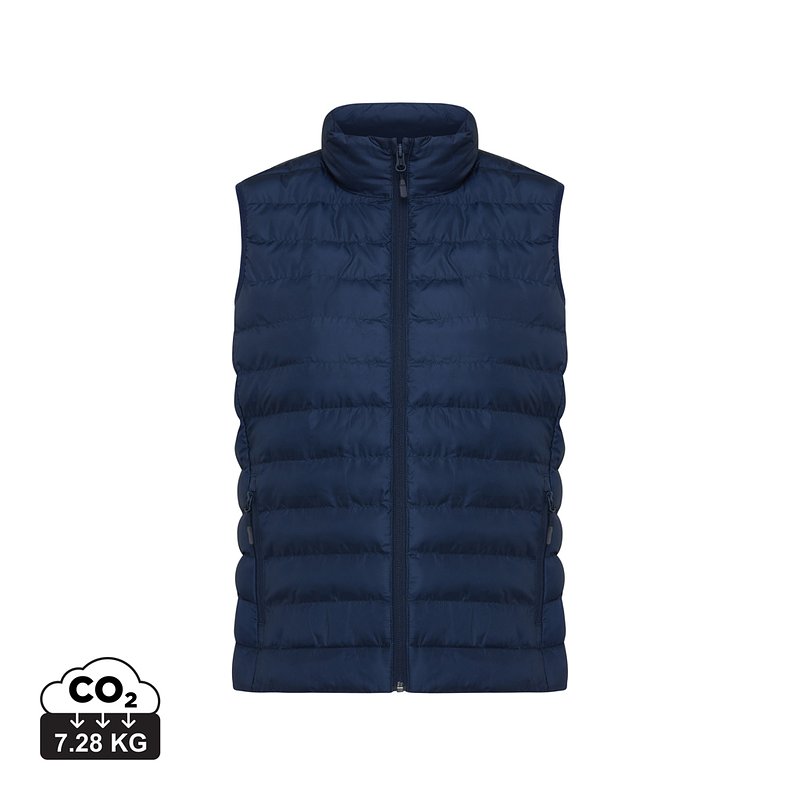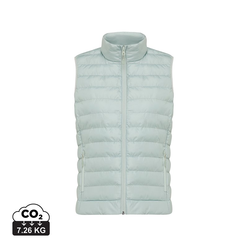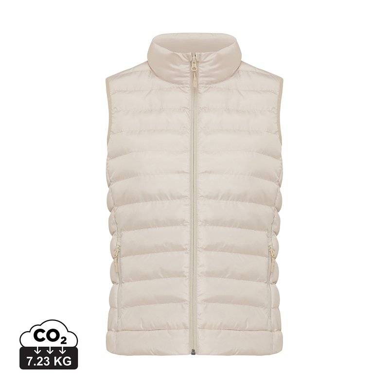 Medium fit women's vest, 100% made from recycled polyester. Fully padded with 100% recycled polyester bead filling. It has a reversed zipper on the front and practical zippered pockets on the side seams. All zippers have additional matching color pullers for a refined look. The armholes have elastic trims and all the interior seams have a clean finish with recycled trims. Fluor/PFAS free water repellent impregnation. The use of genuine recycled fabric materials and environment impact statements are guaranteed through the use of the disruptive physical tracer AWARE™ and blockchain technology. By scanning the QR code, you'll gain access to an exclusive digital passport. 2% of the revenue from each product sold will be donated to Water.org. This product is OEKO-TEX® STANDARD 100 certified. The vest is also available for men.