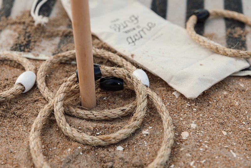 An outdoor game that works equally well on the beach as it does in the park, presented in a canvas bag for easy transportation. The game consists of throwing rope circles onto a stick that simply sticks into the ground. The different sizes of the rings award different amounts of points. A complete instruction manual is included.