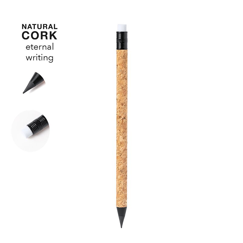 Eternal pencil made of cork. Reusable and with infinite writing, to always use the same pencil and not generate waste. Includes eraser on the top of the pencil. Made with vegetable elements to promote the use of natural raw materials and reduce pollutant emissions.