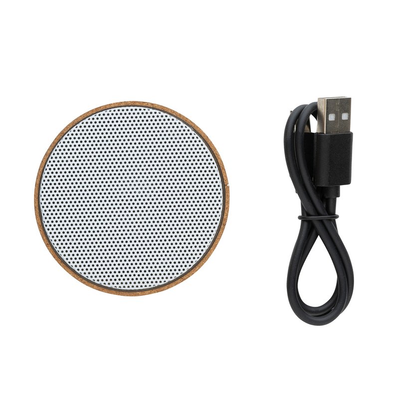 Altavoz inalámbrico de 3W fabricado con carcasa FSC® 100% corcho. El altavoz está equipado con una batería de 400 mAh para garantizar hasta 3 horas de tiempo de reproducción y BT5.1 para una conexión fluida y un sonido claro. El altavoz tiene una luz integrada cuando está encendido. Rango de conexión de hasta 10 metros. Con micrófono y función de descolgar para contestar llamadas. Presentado en caja FSC mix FSC®. Incluye cable de carga de TPE reciclado certificado por RCS. Artículo y accesorios 100% libres de PVC.