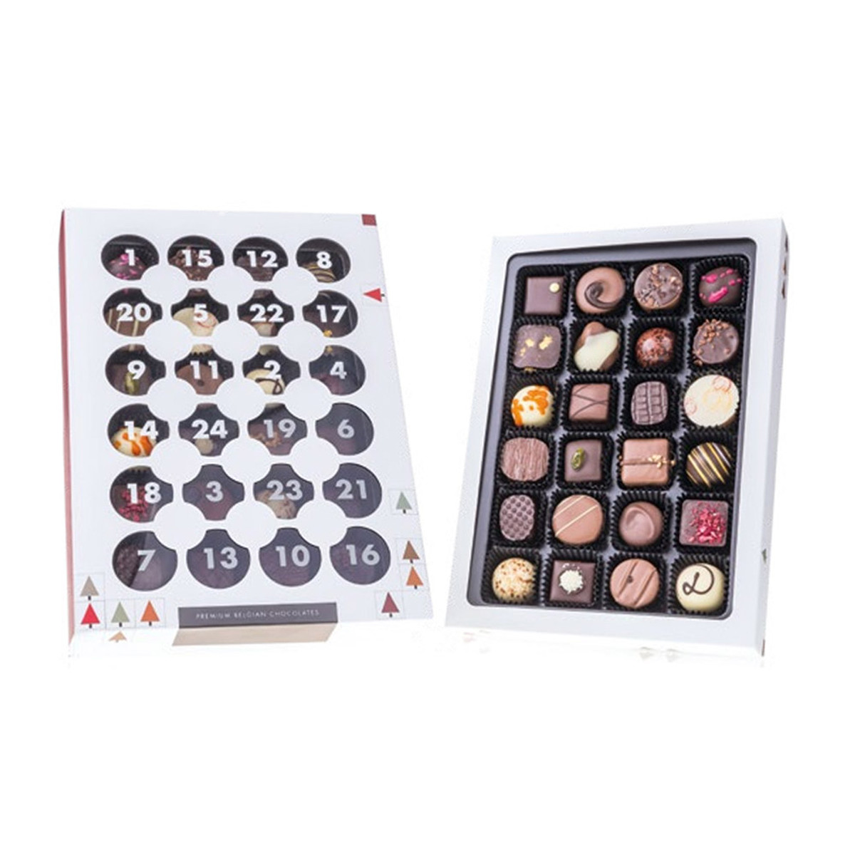 Calendario de adviento de lujo en estuche cartoncillo con 24 bombones belgas premium. ¡Personalízalo con etiqueta o faja a tu gusto!