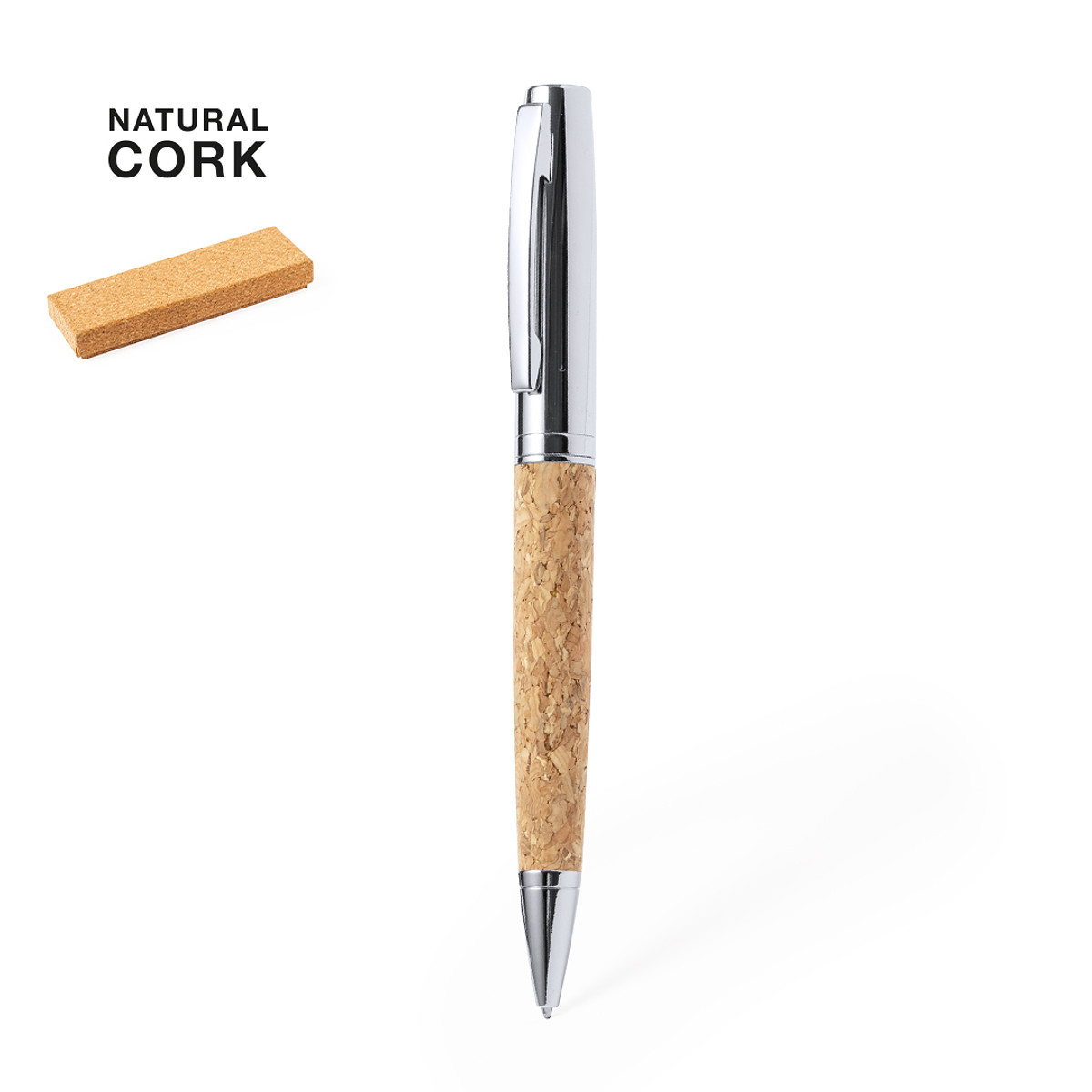 Elegante bolígrafo de corcho y metal con mecanismo giratorio. Cuerpo en resistente metal de acabado brillo y empuñadura en corcho. Clip metálico y en tinta azul. Presentado individualmente en un estuche de corcho.Elaborado con elementos vegetales para así fomentar la utilización de materias primas naturales y reducir las emisiones contaminantes.