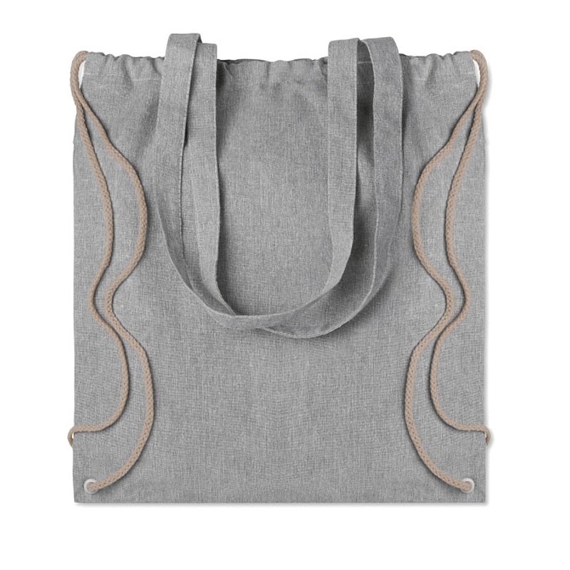 Bolsa de la compra jaspeada de algodón y poliéster reciclado con cuerdas y asas largas (20%/80%). 140 gr/m². Este artículo puede encogerse después de imprimir.