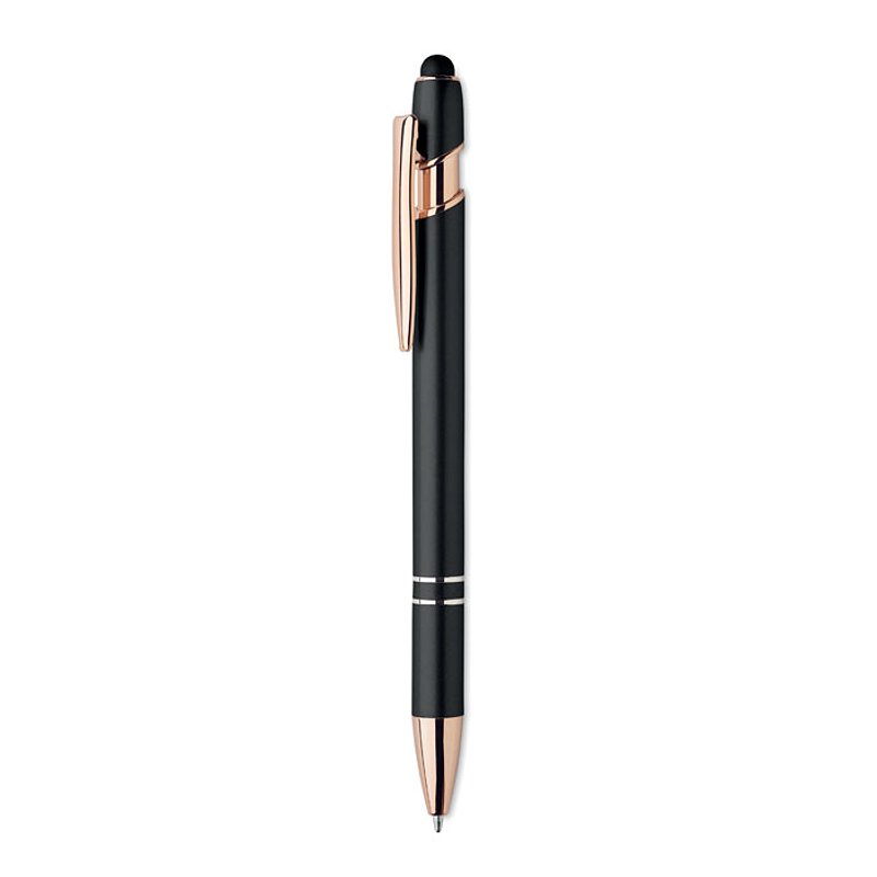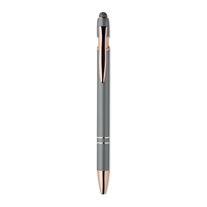 Bolígrafo de aluminio reciclado con detalles en oro rosa. Tinta azul.