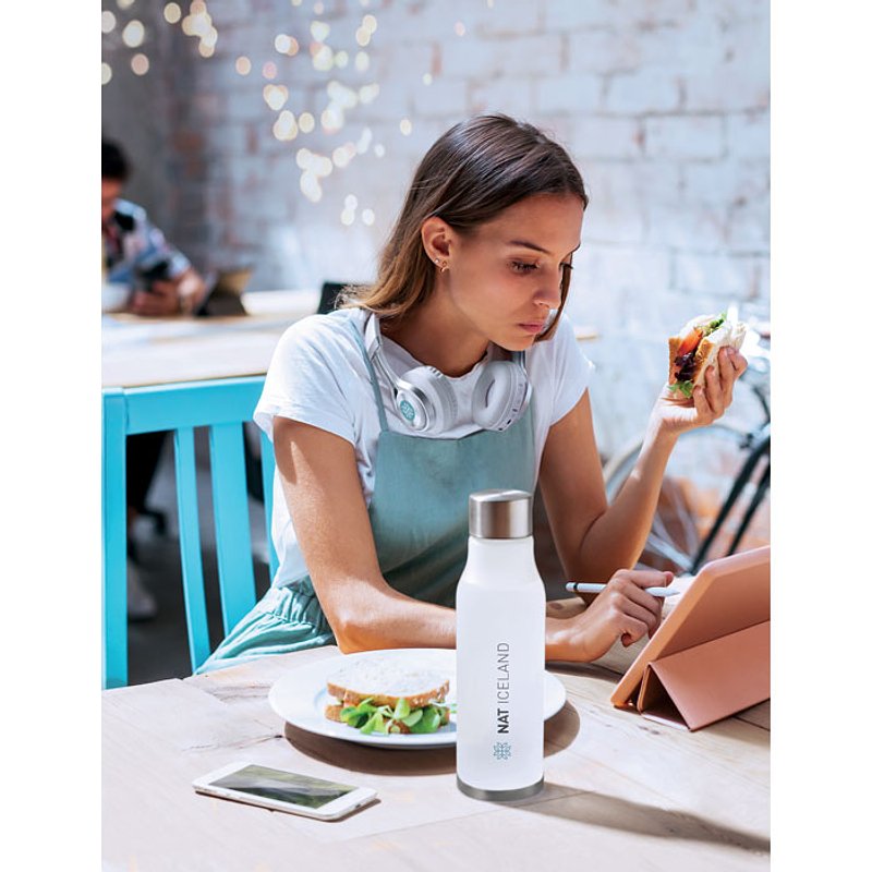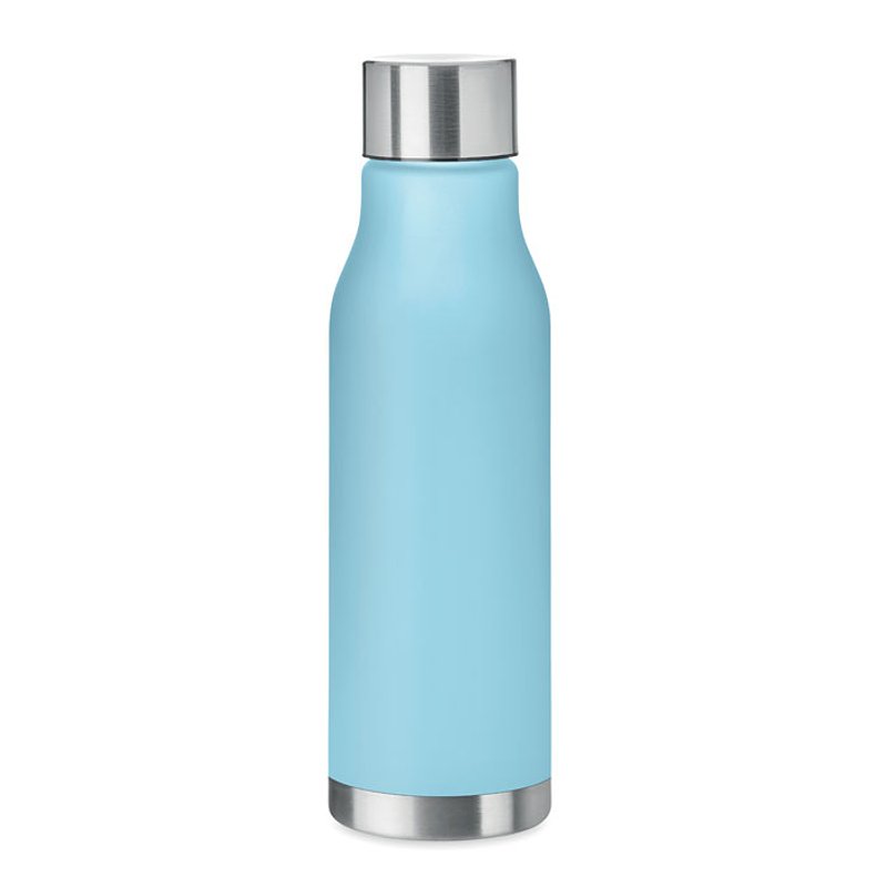 Botella translucida de RPET con acabado suave y tapón de acero inoxidable con interior de RPET y anillo de silicona. Libre de BPA. Anti fugas. Capacidad: 600 ml. No apto para bebidas gaseosas.