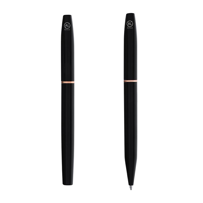 Set de bolígrafo y roller fabricados en Aluminio Reciclado, en elegante diseño negro mate con distinguidos accesorios en acabado oro rosa. Bolígrafo de mecanismo giratorio y roller con capucha, ambos con clip metálico. En tinta azul y logotipo de Aluminio Reciclado. Presentación en elegante estuche negro.El Aluminio Reciclado es un material con posibilidades de reciclaje casi infinitas, sin perder sus propiedades originales y consumiendo menos energía en este proceso.Certificación GRS (Global Recycled Standard / Estándar de Reciclaje Global,NULL), que garantiza el origen reciclado del material usado para fabricar el producto.
