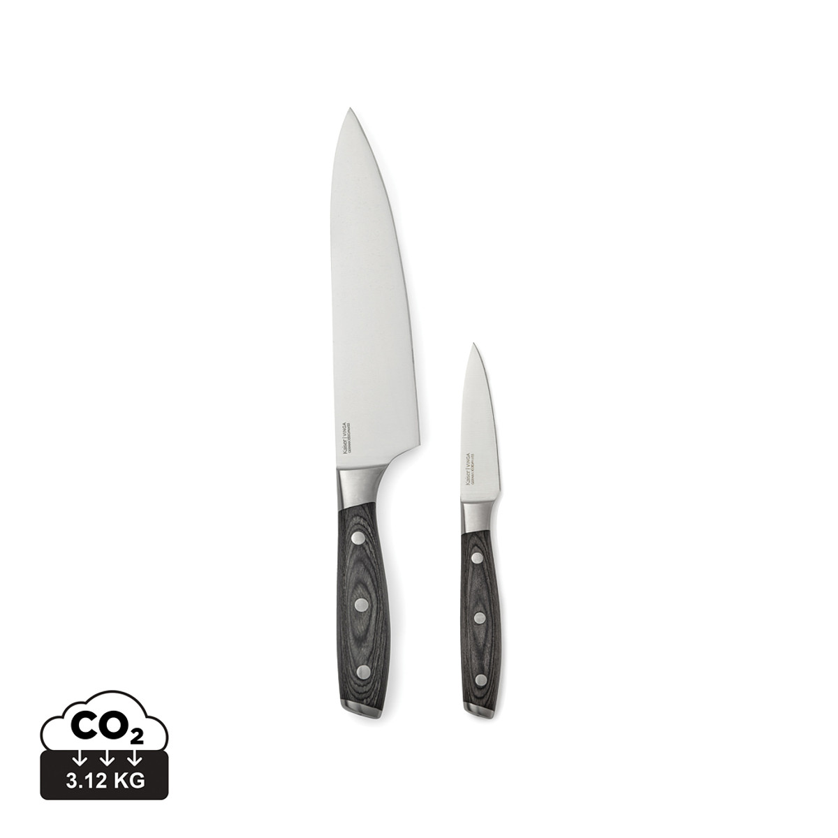 Set of a chef's knife and a vegetable knife. The knives are made from German X50CrMoV15 steel with a Pakkawood handle. The easy-grip handle and excellent blade balance make the knife comfortable and easy to handle. Chef's knife: 20 cm blade. Vegetable knife: 8 cm blade.